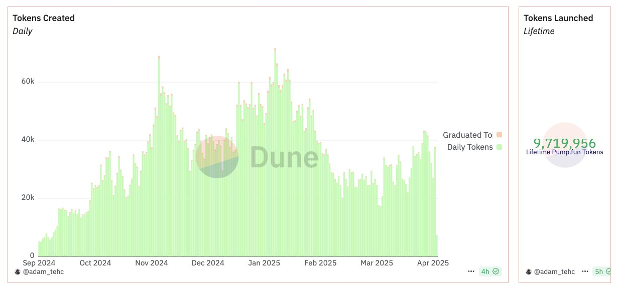迄今为止已创建 970 万种代币,4 月份每天推出 2 万至 4 万种代币,每天有 100 至 350 种代币毕业(毕业率为 0.4%至 0.8%)。