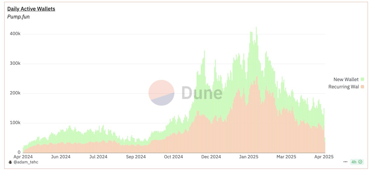 在 2024 年 12 月至 2025 年 2 月的峰值期间,Pump.fun Memecoins 的日均交易用户数达到 20 万至 40 万。此后呈下降趋势,过去两个月一直低于 20 万。