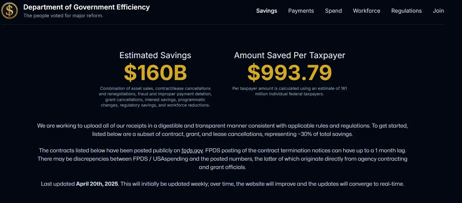 根据 DOGE 官网数据,截至 2025 年 4 月 20 日,DOGE 总计节省约 1600 亿美元,平均为每位纳税人节省约 993.79 美元,节省范畴涵盖多个领域:
