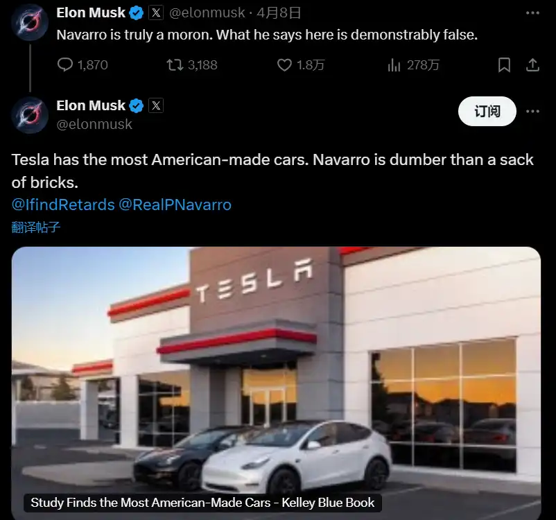 特别是针对贸易顾问彼得·纳瓦罗,马斯克也发表过许多抨击和讽刺言论。4 月 8 日,他回复了一条引用了纳瓦罗采访帖子,内容是纳瓦罗称特斯拉更多是「组装商」而非「制造商」,并批评其零部件来自中国、日本和台湾。马斯克直接开麦怒喷:「纳瓦罗真是个白痴,他这里所说的明显是假的」,随后附带了一个社区笔记证明特斯拉 Model Y 是「最美国制造的汽车」。回击一次似乎不解气,马斯克又在另一条帖子中进一步称纳瓦罗「比一袋砖头还笨」。
