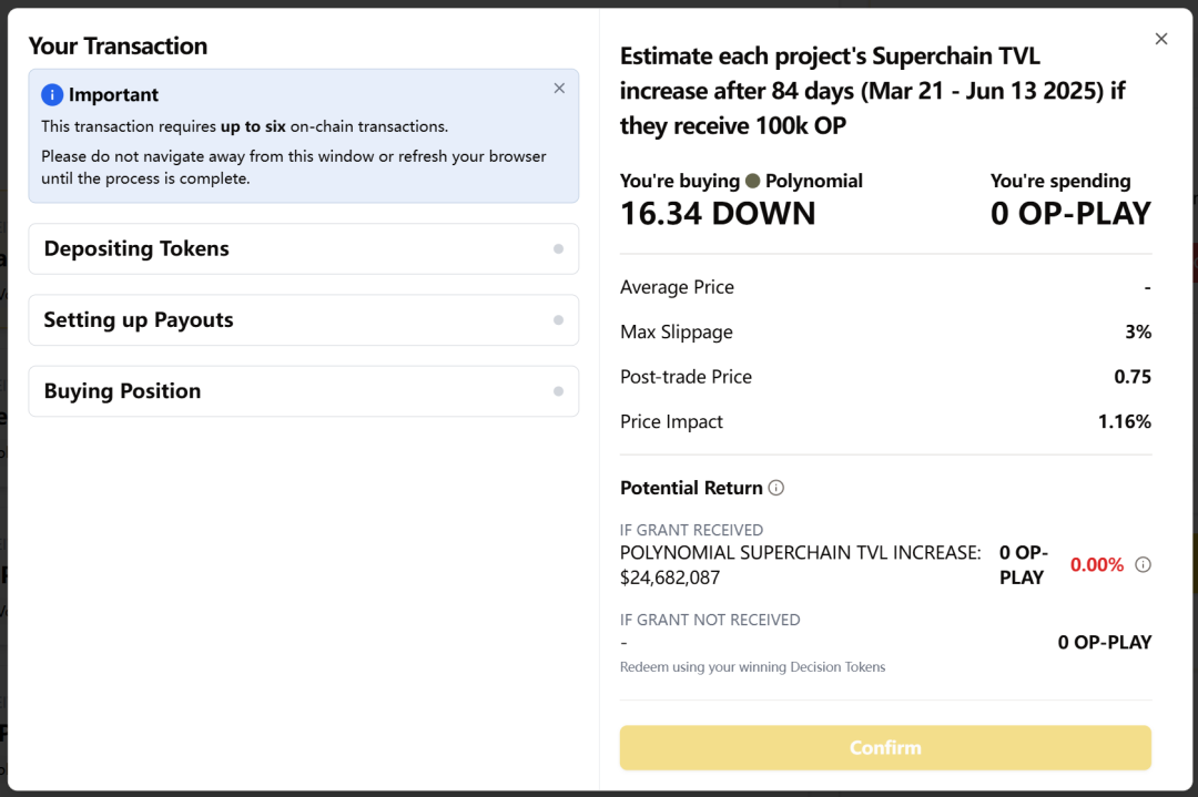 此次参与 Futarchy 的项目有 23 个,每个参与实验的人需要预测这 23 个项目在”拿到 100k OP 激励“之后的 TVL 增量,在实验开始之时,所有项目的初始预测 TVL 都是一样的(同一个起跑线,作为参考,在测试实验的项目选择中),随着时间进行,用户将 OP-PLAY 抵押,通过对不同的项目买看涨期权(UP token)和看跌期权(DOWN token)来展开博弈,预测结果最高的五个项目每个项目获得 100k OP 的激励。