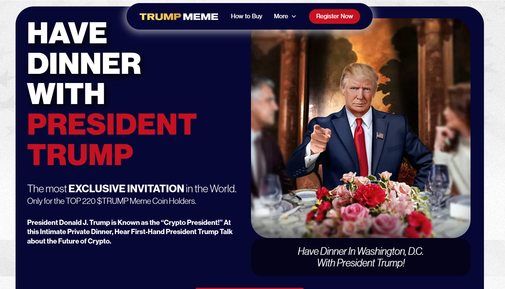 发了MEME币的懂王特朗普似乎也很懂加密行业的营销“套路”。4月23日,美国总统特朗普推出的meme币项目$TRUMP 官方发布了一项“独家福利”:将为前220名代币持有者举办一场“与特朗普共进晚餐的机会”。根据官网信息,这场盛大的聚会计划于今年5月22日在华盛顿的特朗普高尔夫俱乐部举行,宣传语具备很强的感染力,称活动为“全世界最独家的邀请”。