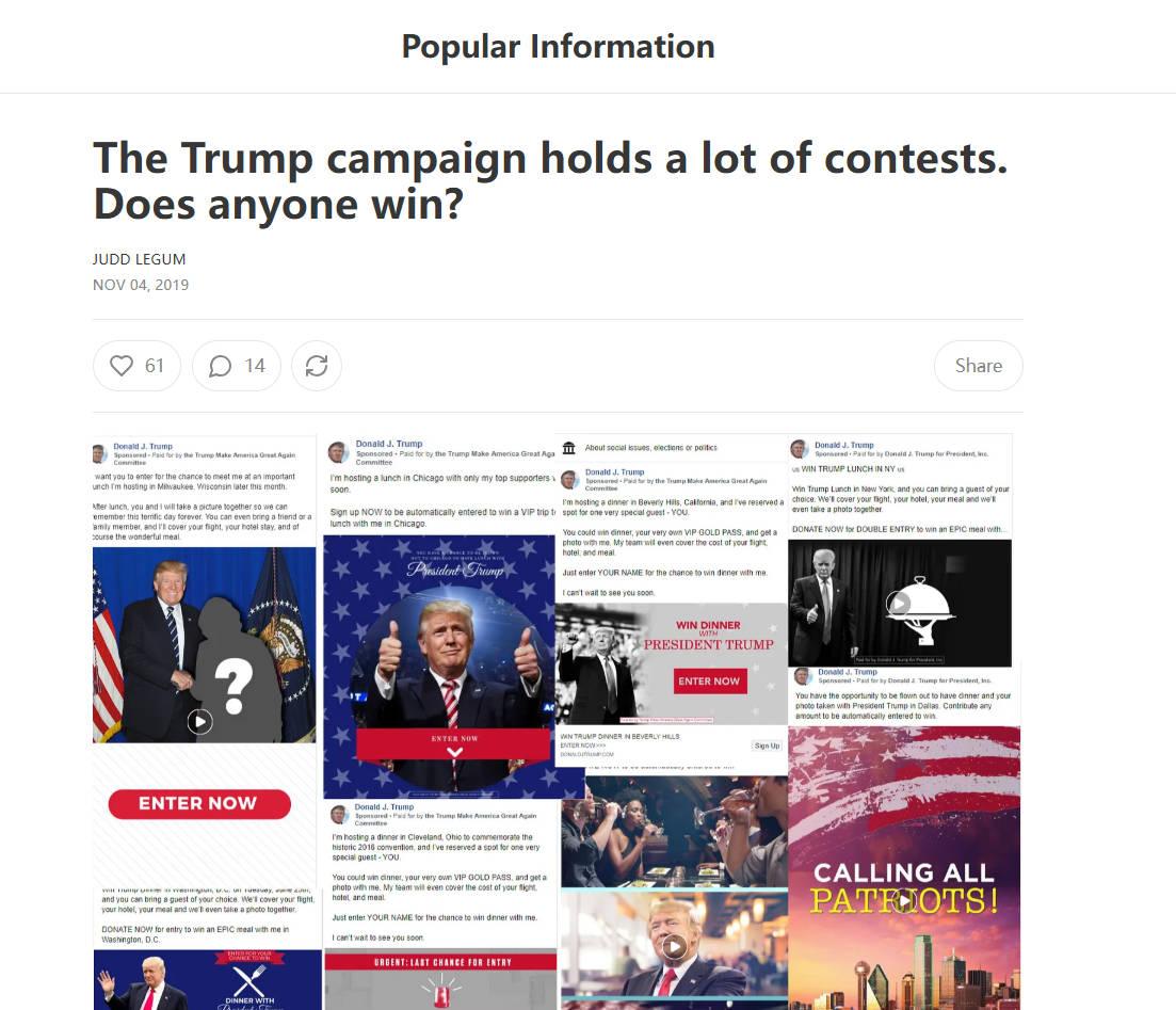 2019年11月,一系列为特朗普竞选捐款者提供的与他共进早餐、午餐或晚餐的竞赛被谴责为“欺诈”。根据《卫报》等媒体的报道,记者Judd Legum领导的新闻组织Popular Information核查了特朗普竞选团队自2018年以来举办的至少15场提供与总统共进早餐、午餐或晚餐机会的竞赛。该网站称:“支持者被诱惑向特朗普竞选捐款,承诺提供免费旅行、住宿以及在全国各地与特朗普共进‘伟大’一餐的机会。”然而,Popular Information的调查“没有发现任何证据证明有人真正赢得了这些奖项。”