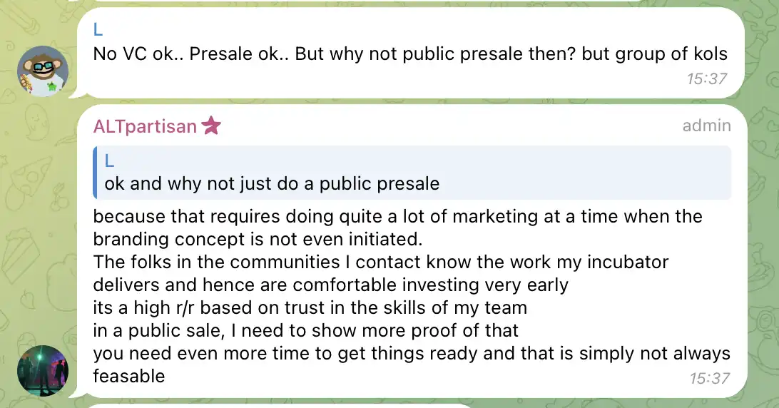ALT 认为几乎没有一种方式能让所有类型的投资者都满意,而为了项目发展他已经选择了对一个正规项目最适合的路径。我们可以在社区中得知对这些社区的预售市值价格是跟代币发射时的 IMC「初始市值」相同且有一定的贩售限制,团队宣称对每个出售的代币地址都进行了监控,以便随时应对。