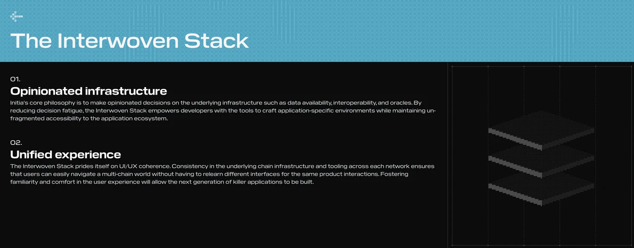 Initia 是一个基于 Cosmos SDK 构建的第一层区块链,结合了具备主观设计理念的 Rollup 架构。它通过将独立的应用链(Appchains)编织成一个“交织式”网络,实现链间经济激励的一致性,并支持无缝的跨链资产转移。