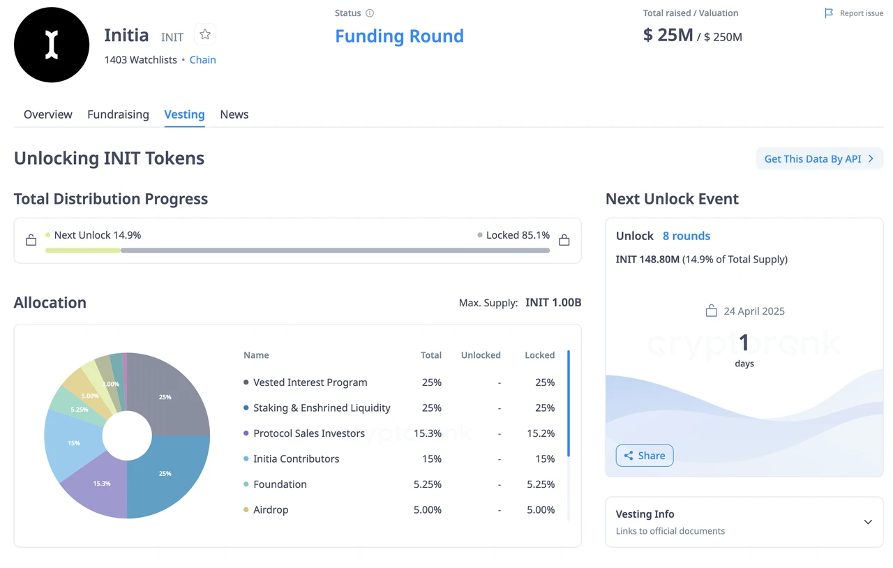 该项目已通过私募融资和 Echo.xyz 销售共筹集 2, 500 万美元,并于 2025 年 4 月 18 日至 24 日在币安 Launchpool 启动了 3, 000 万 INIT 的挖矿活动,随后于 2025 年 4 月 24 日开启现货交易。