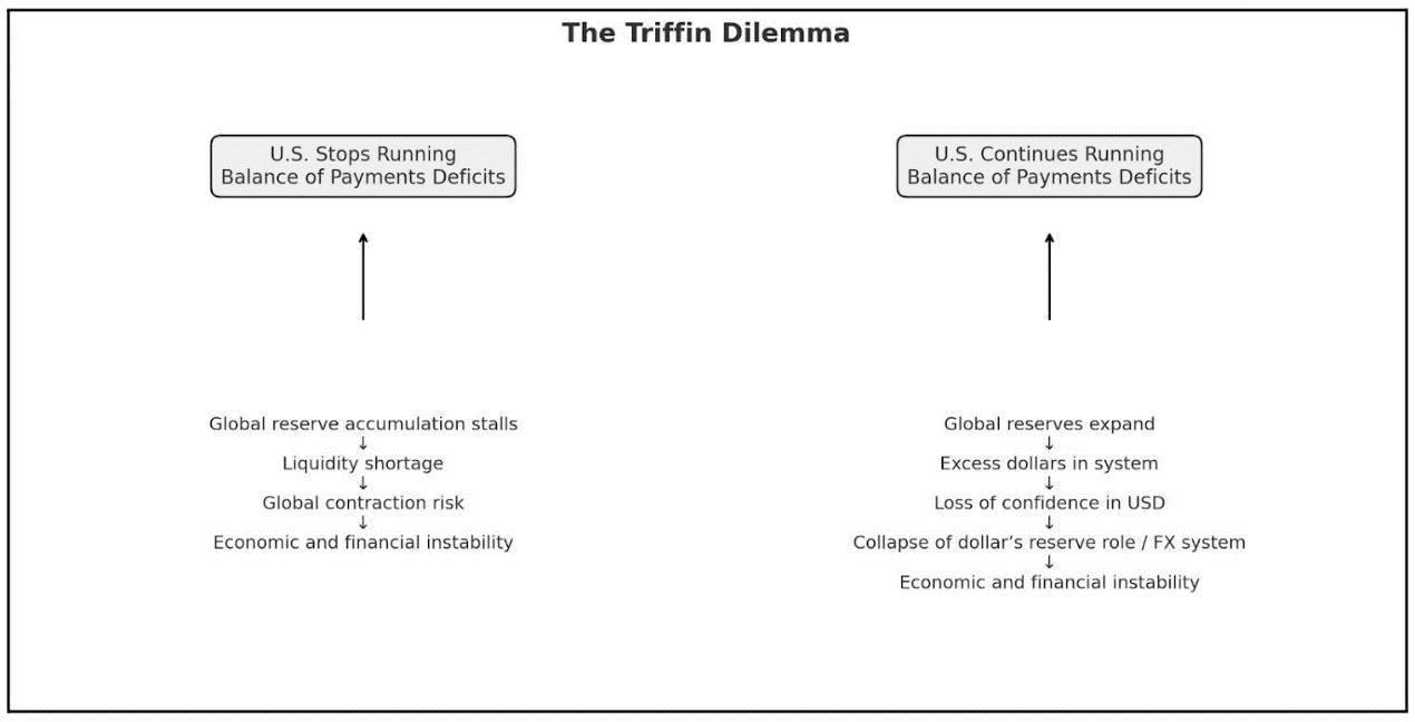 要做到这一点,必须充分理解政府的观点。我们在两周前的文章《Seeing the Stag》中提到了试图通过瞄准其他国家的逆差来重新平衡全球贸易所面临的挑战。“特里芬两难”描述了一个储备货币国家面临的悖论(在美元与黄金的可兑换性终止之前就曾出现过)。这个悖论如下: