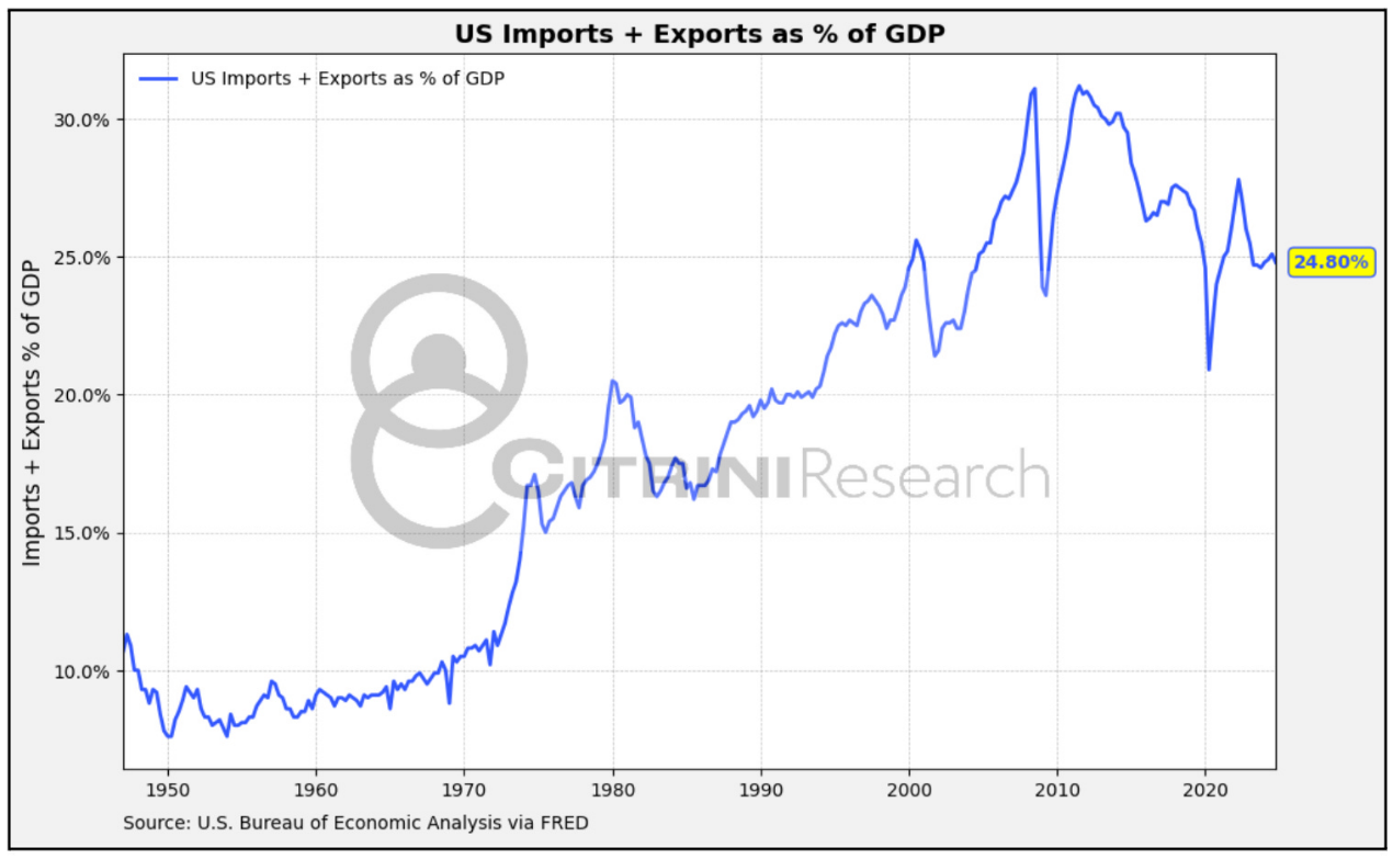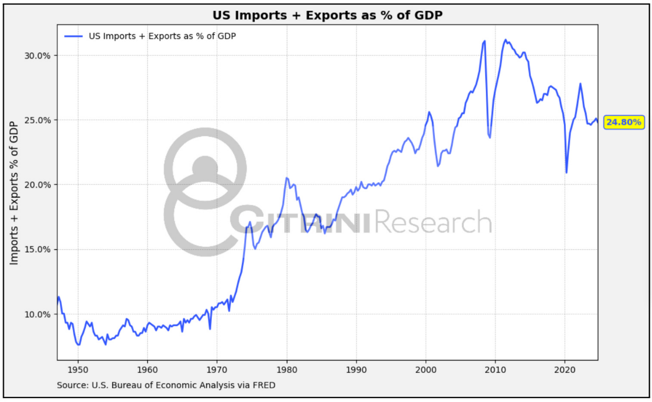 首先是全球贸易。近一个世纪以来,美国一直是世界商业网络的中心节点——不是因为它生产最便宜的商品,而是因为它提供了最深厚的市场、最值得信赖的货币和最广泛的消费者群体。贸易一直是美国繁荣的幕后功臣,使美国能够进口低成本商品、出口高附加值服务,并将全球盈余转化为国内资产。