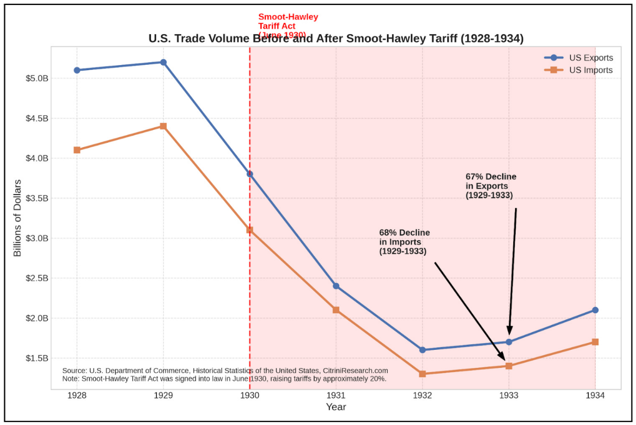 市场和政策制定者将斯姆特法案解读为不只是关税问题,更是一种世界观:孤立主义、混乱且非理性。不确定性抑制了商业投资。