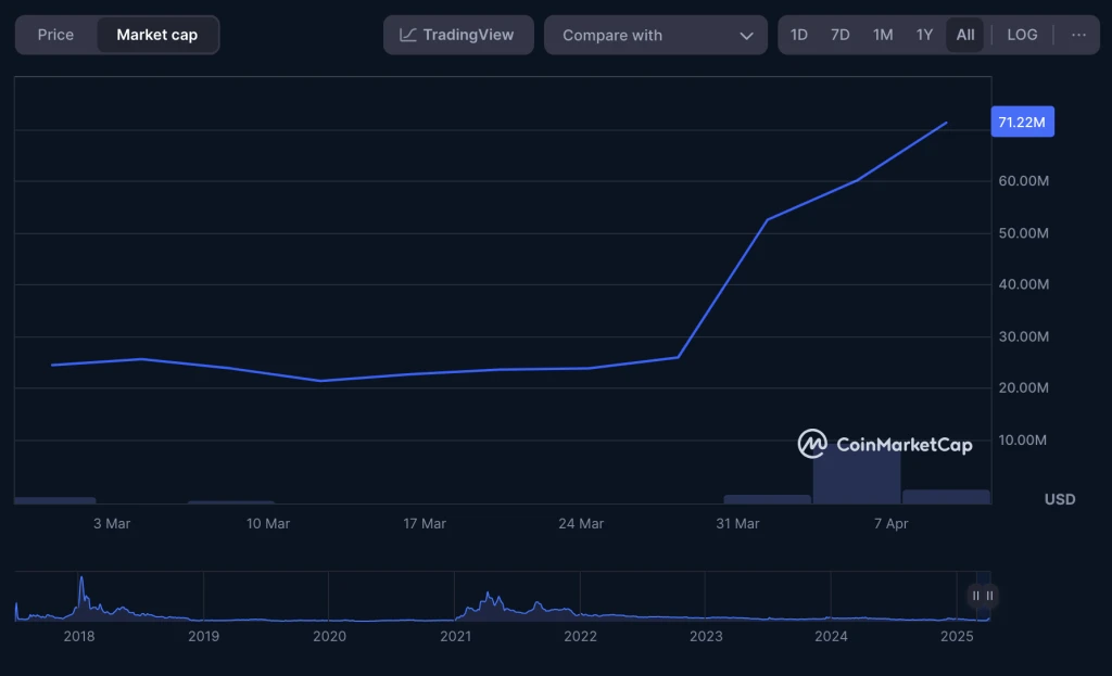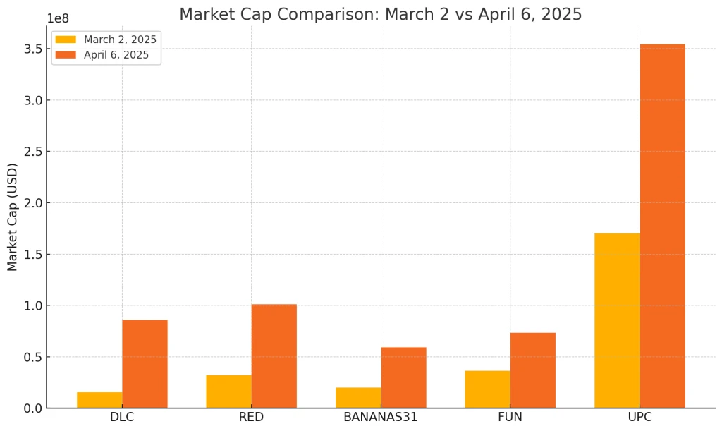 我们采用数据驱动的方式来筛选这些市值黑马。团队回溯 2025 年 3 月 2 日至 4 月 6 日期间,从 CoinMarketCap 等聚合平台调取的市值快照,重点关注代码一致、无频繁更名且初始市值不过低的项目,以避免百分比失真。最终名单锁定在「高增幅 × 充足流动性 × 社区活跃度高」三者兼具的代币。
