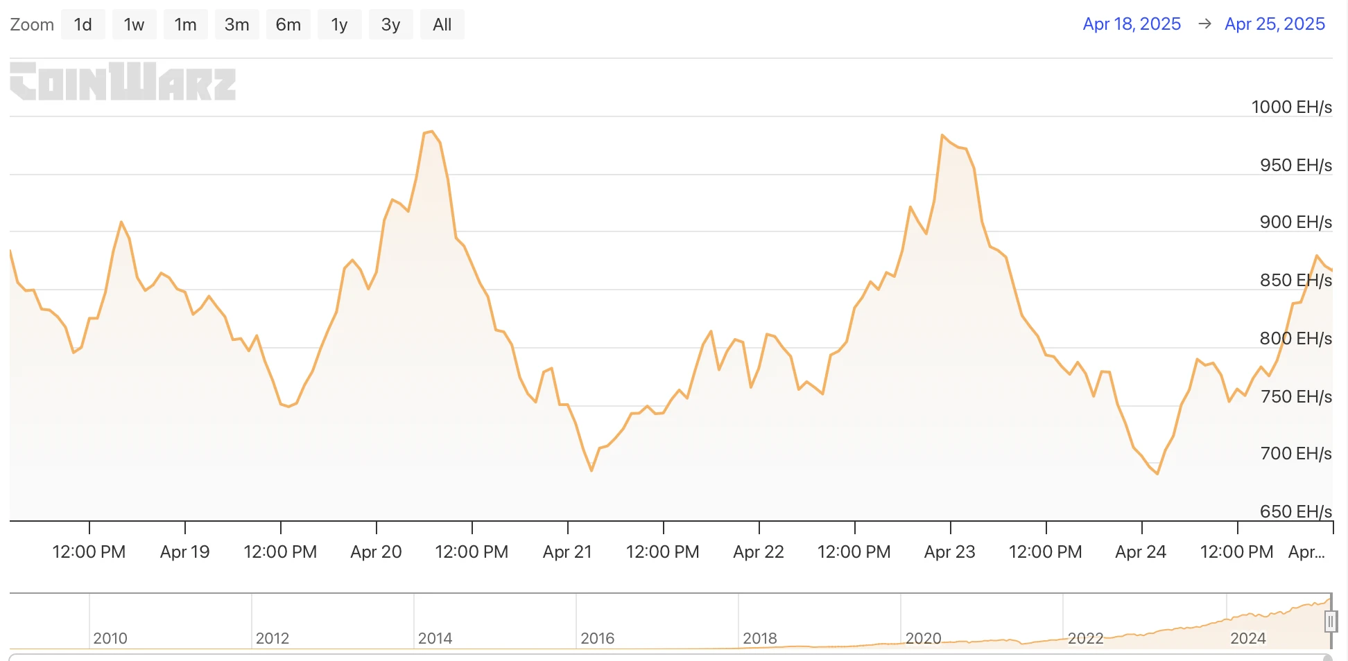 进入 4 月 24 日,哈希率有所恢复。比特币网络哈希率先回升至 789.24 EH/s,随后的小幅回调后再度攀升至 878.77 EH/s,显示出矿工情绪的逐步修复。至 4 月 25 日,截至撰稿时,哈希率继续延续前一日的反弹势头,攀升至 882.77 EH/s,表明矿工逐步恢复了对比特币长期增长的信心。