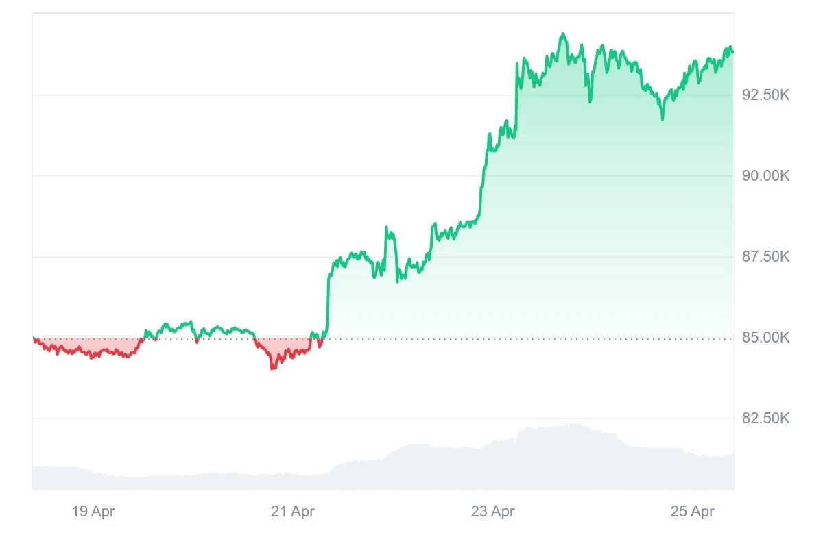 本周,比特币市场情绪由谨慎转向乐观。4 月 22 日,比特币价格突破关键心理关口 90, 000 美元,最高触及 90, 900 美元,成为市场短期复苏的重要信号。此后,于 4 月 23 日连续突破 92, 000 美元和 94, 000 美元,体现出资金情绪明显转暖,买盘力量增强,推动价格进一步上行。这一轮反弹与市场对避险资产配置的重新评估密切相关,同时也受到美联储政策预期波动与宏观不确定性的推动,使比特币再次成为资本关注的焦点。