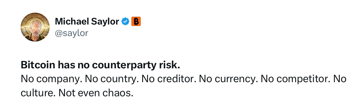 4 月 20 日消息,Strategy(原 MicroStrategy)创始人 Michael Saylor 在 X 平台发文称,比特币不存在对手方风险,不依赖公司、国家、债权人、法币、竞争对手或文化,甚至不惧混乱。