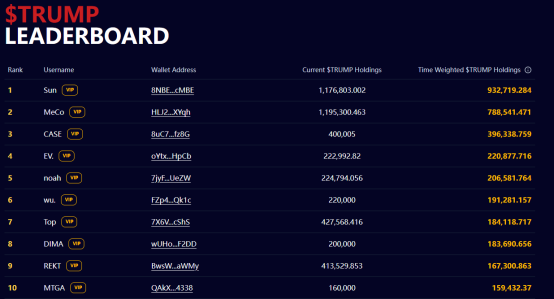 可与总统见面,白宫都成旅游景点,无论是从人脉资源还是仅为社交场面,参与者都眼前一亮。而Trump也是真会玩,为了促进大户比拼和购买,还特意设立了持币龙虎榜,大搞营销曝光,实时给持有者排名,持有量与持有时间都将列入考量,游戏规则就是只要在4月23日至5月12日期间持有足够多的 TRUMP,并保持持仓,就能成功获得晚宴名单。