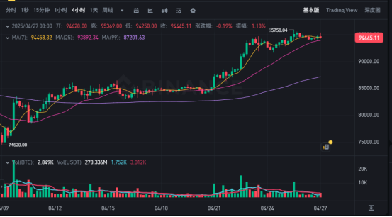 加密市场在其中获益良多,不仅占据了避险叙事,也成为了反弹流动性的强势补充。加密市场从4月22日的8.4万美元,一路上扬,并于今日一度突破了9.5万美元,现报9.4万美元,单周上涨超过10%。以太坊表现虽略为逊色,但也同样回到1800美元上方。