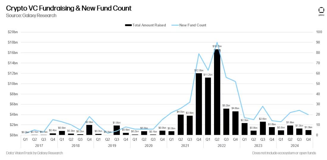 在疲软的市场中,新的加密基金的募资同样充满挑战。Galaxy Digital报告显示,尽管2024年全年新基金数量有所增加,但按年率计算,2024 年是自 2020 年以来加密风险投资融资最疲软的一年,共有 79 只新基金筹集了 51 亿美元,远低于2021至2022年牛市期间的狂热水平。