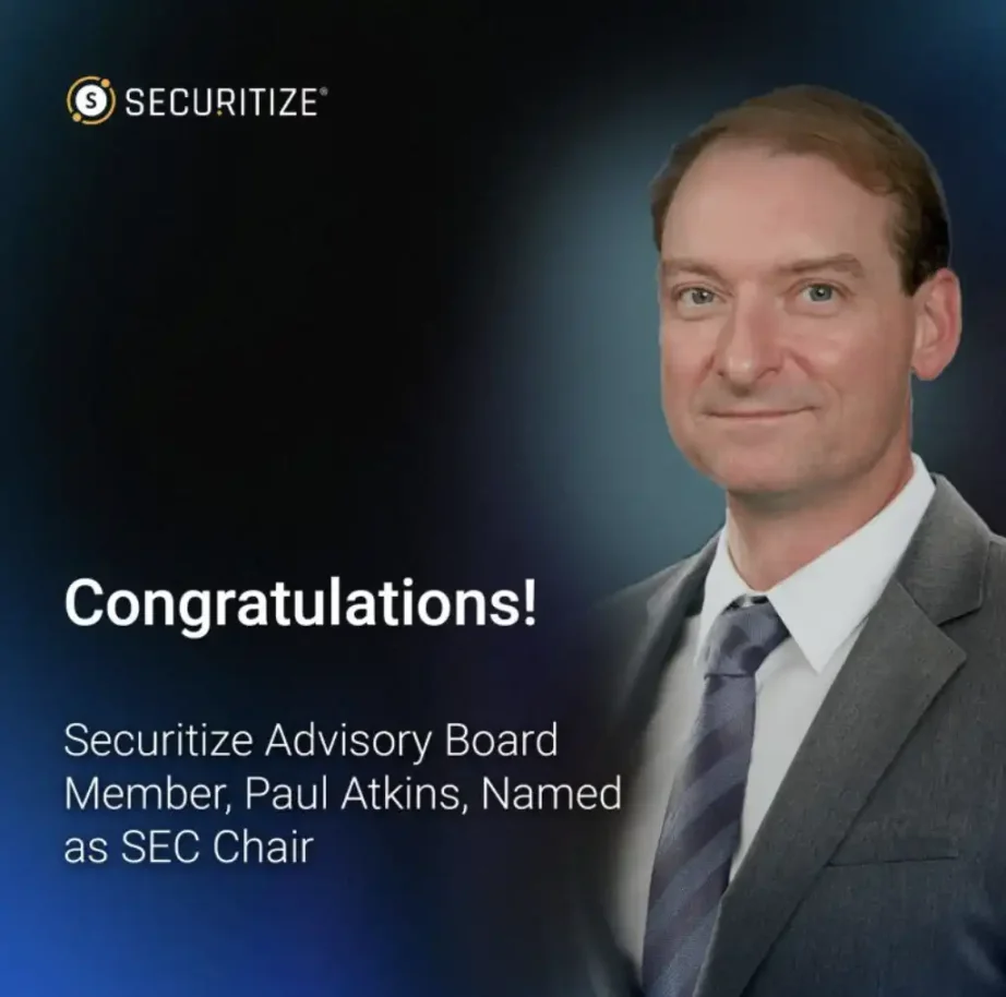 就在特朗普宣布提名 Atkins 为下一届 SEC 主席时,Securitize 的 CEO Carlos Domingo 专门在领英上道贺:「我们对这项任命感到无比欣喜;虽然我们失去了一位优秀的顾问,但同时也迎来了一位出色的 SEC 新主席。」同时,Securitize 官方领英账号也制作了专属贺图。
