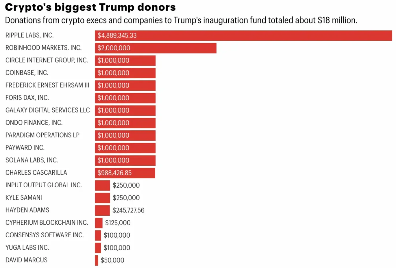 特朗普今年重回白宫,给自己举办了史上最为奢华的就职周。据福布斯报道,来自企业支持者和高管捐款高达创纪录的 2.39 亿美元。其中,加密行业作为特朗普最积极的支持者之一,贡献了 1800 万美元。长期与 SEC 对簿公堂的 Ripple,捐款近 490 万美元,在所有捐款者中位列第二。当然,这笔钱花得很值。SEC 随后撤销了对特朗普就职基金捐款者的诉讼或威胁诉讼,包括 Coinbase、Crypto.com、Uniswap、Yuga Labs、Kraken 和 Ripple。