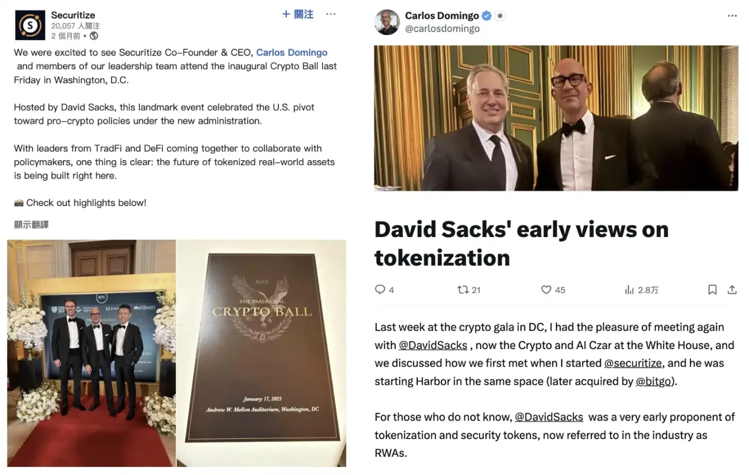 不只是 SEC,Carlos Domingo 似乎与白宫「加密沙皇」David Sacks 也相处融洽。虽然 David Sacks 没有与 Securitiz 直接的业务往来,但 Domingo 不仅受邀参加了今年 2 月在华盛顿举办的「Crypto Ball」,和 Sacks「再次见面」,还在会后专门发长文回顾 Sacks 早期关于代币化和 RWA 的观点。