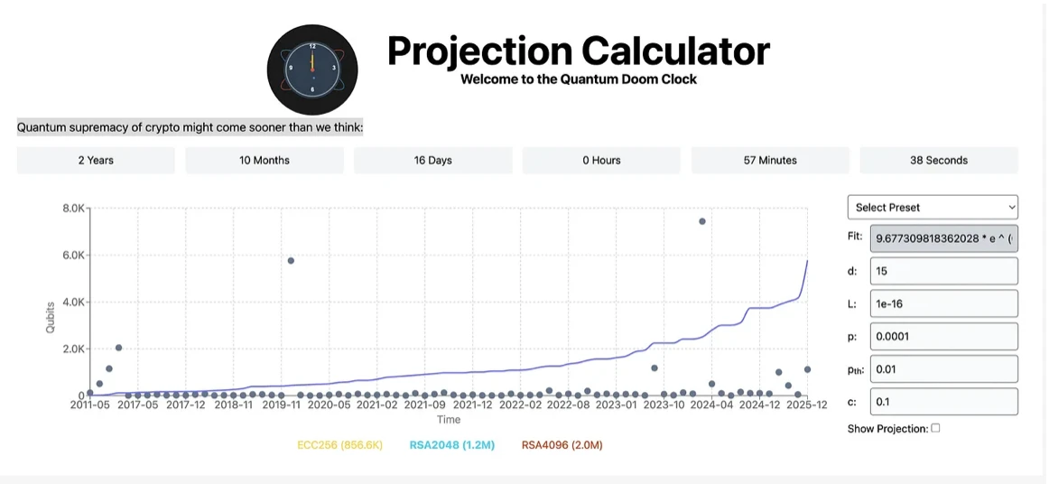 在下图的“ 量子末日时钟 ”里,Quip 绘制出自 2017 年以来,量子比特(qubit)的增长趋势图,并据该图预测:首次具有商业可行性的量子加密攻击会发生在 2027 年至 2028 年之间。