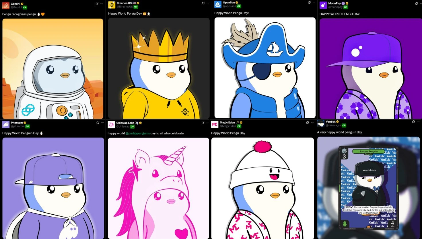 4 月 26 日,Pudgy Penguins 官方账号借“世界企鹅日”发布 相关推文 ,随后,该消息得到 MetaMask 、 VanEck 、 Uniswap 、 Magic Eden 、 MoonPay 、 Phantom 、 Drip 、 Binance.US 、 Gemini 等平台、机构的响应支持。