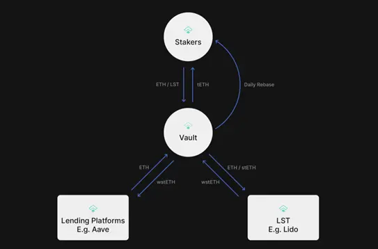 用户通过存入 ETH 或液态质押代币 (LST),收到与其在整体 tETH 池中的份额成比例的 tETH,代表其在池中的权益。随后,协议执行一系列重新平衡操作以通过套利获得真实收益,包括: