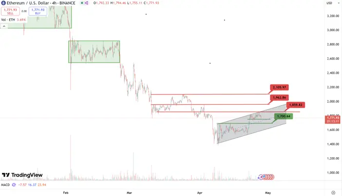 对于ETH来说,反弹仍困难重重,因上方面临多个强阻力,其中,最近的一线阻力可关注1860美元,其次为1960美元二线阻力以及2100美元的三线阻力,按照当前基本面的不确定性趋势来看,本周甚至下周的反弹暂时难以突破2100美元以上。