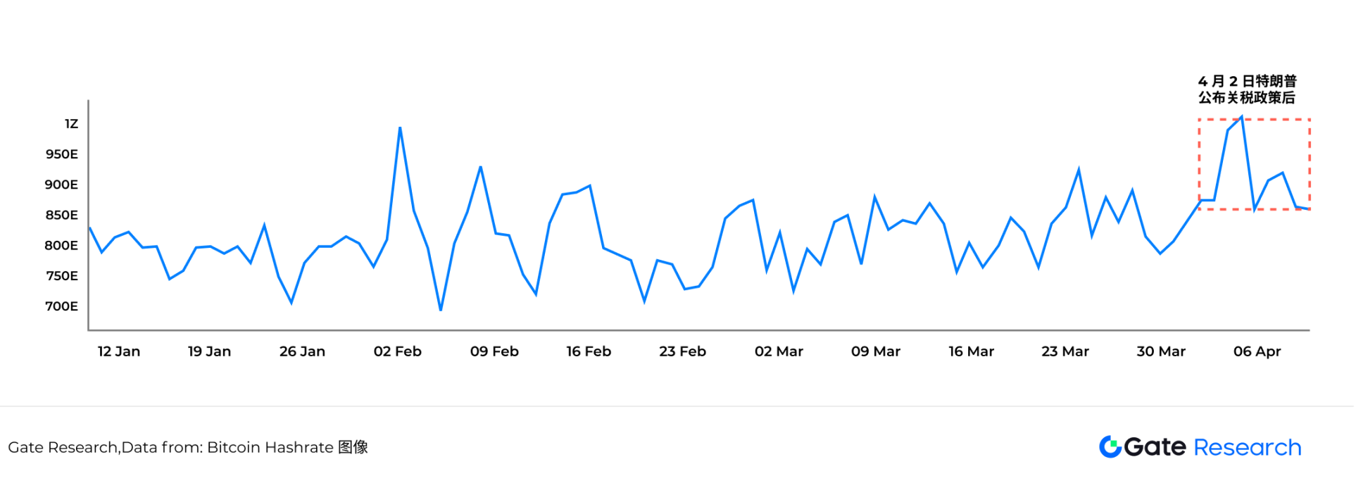 云算力公司的收入主要由全网算力驱动,全网算力上升时,证明大部分矿工仍然看好比特币后市的价格,或有更多的客户选择购买云算力;全网算力下降时,意味着矿工不看好比特币价格的走势,全网算力中云算力的部分亦会减少。下图数据显示,4 月 2 日特朗普公布关税政策后,比特币日均全网算力甚至在 4 月 5 日创历史新高,首次突破 1 ZH/s。【12】