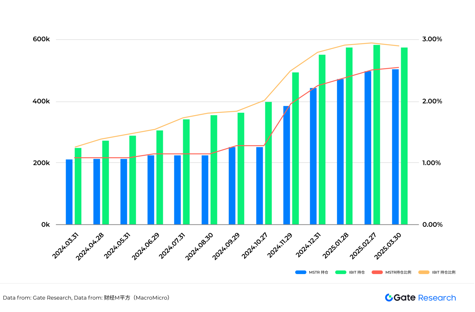 但从长期来看,比特币的核心逻辑在 2024 年发生了根本性的变化。以贝莱德 IBIT 为代表的比特币现货 ETF 基金,和以 MicroStrategy 为代表的美股囤币公司仍掌握了比特币的定价权。截至 2025 年 4 月,IBIT 持有 570,983 枚比特币【13】,MicroStrategy 持有 528,185 枚比特币【14】。两者的比特币持仓占比特币的流通总量持续提升【15】,两者的购买力足以消化每天新生产比特币的数量。