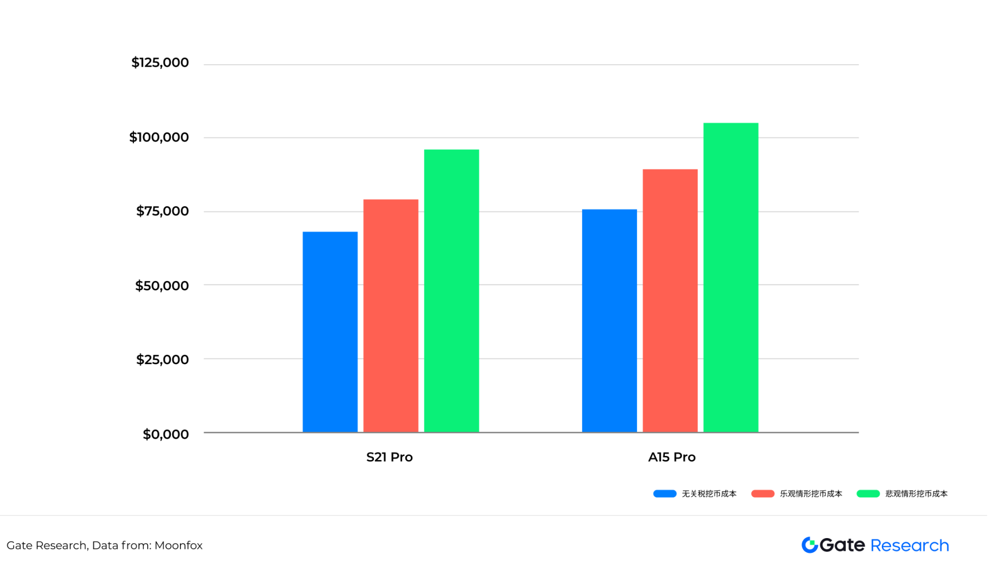 一旦关税政策落地,乐观情形下,出口矿机的售价在原有基础上增长 30%,则 S21 Pro 每挖 1 枚比特币的成本为 $80,105, A15 Pro 每挖 1 枚比特币的成本为 $88,717。悲观情形下,出口矿机的售价在原有基础上增长 70%,则 S21 Pro 每挖 1 枚比特币的成本为 $95,756, A15 Pro 每挖 1 枚比特币的成本为 $105,938。