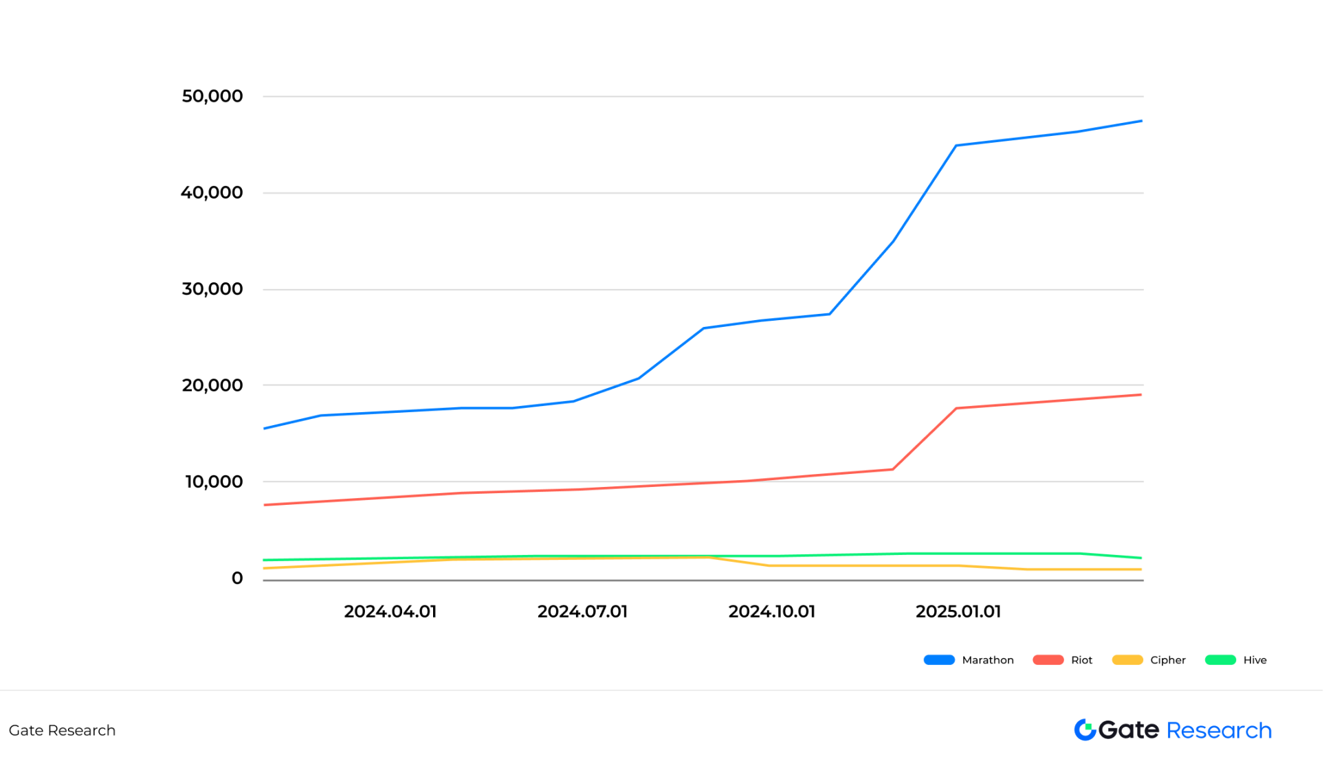 对于现金流紧张的小型矿场而言,比特币价格的下跌对其股价影响尤为显著。由于资金有限,这些矿场通常无法长期持有所挖比特币,只能在挖出后立即出售以维持运营资金。在市场低迷期间,这种「挖即卖」的策略可能加剧市场的抛压,进一步影响比特币价格走势。如下图所示,Cipher 和 Hive 两家公司 2025 年 3 月持有比特币的数量分别为 1,034 和 2,201,同比分别下跌 40% 和 3%;而 Marathon 和 Riot 两家公司 2025 年 3 月持有比特币的数量分别为 47,531 和 19,223,同比分别上涨 173% 和 126%。