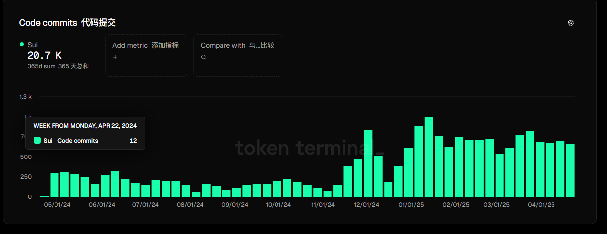 此外,开发者的活跃也是Sui网络增长的底层原因之一。在Github上,Sui网络的代码提交近期也较为频繁,从2024年12月开始,Sui网络的代码提交频率就进入高峰,基本都维持在每周500次以上,而此前的这一数据基本维持在250次左右。作为对比,Solana和Aptos的的代码提交频率基本维持在100左右。