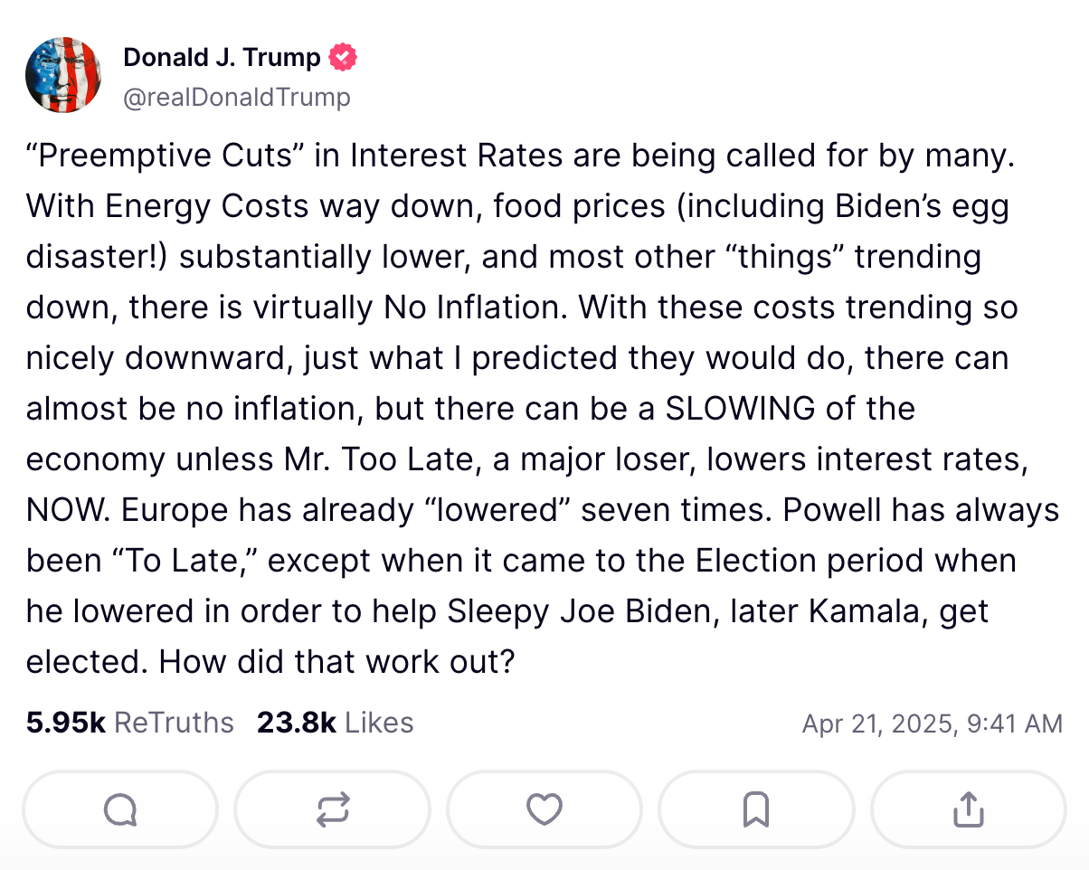上述博弈一直持续至今。上周,特朗普多次暗示有意解雇鲍威尔,而市场对此反应不佳。周一,特朗普在社交平台Truth Social上抨击鲍威尔为“彻头彻尾的失败者”,此举引发市场崩盘。作为回应,据报道,美国财政部长斯科特·贝森特已向特朗普表达了对解雇鲍威尔这一风险的担忧。目前看来,特朗普似乎已有所妥协,于周二表示不会解雇美联储主席。