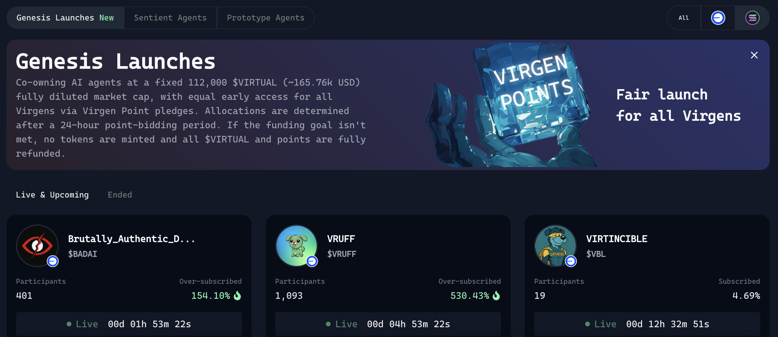 Genesis Launches是由基于Base和Solana上的Virtuals Protocol近期推出的发射平台,核心目标是让社区用户公平早期参与新AI Agent项目的孵化、防止机器人和狙击手低价抢筹以及保护参与者资金安全。每个新项目以11.2万枚$VIRTUAL(约12万美金)的固定稀释市值起步,用户通过质押Virgin Points参与,每轮有24小时竞拍期,积分越多,分配越高。目前,用户有三种主要方式可以赚取积分:通过投资Sentient和Prototype Agent代币赚取Trenchor积分、持有$VIRTUAL代币赚取以及质押$VADER代币赚取,未被使用的积分将在30天后过期。
