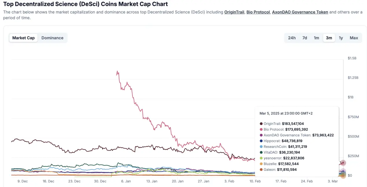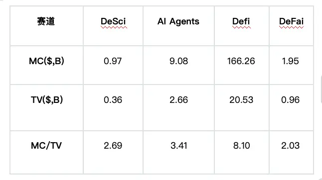 当前 DeSci 赛道整体市值约为 10亿美元,日均交易量维持在 800万-1200万美元 区间,市值/交易量比率(MC/TV)达到 8-15倍,显著高于传统科技股(标普500平均MC/TV约 0.3倍)甚至加密货币主流赛道(DeFi平均MC/TV约 3倍)。这种异常比值揭示了市场的深层逻辑: