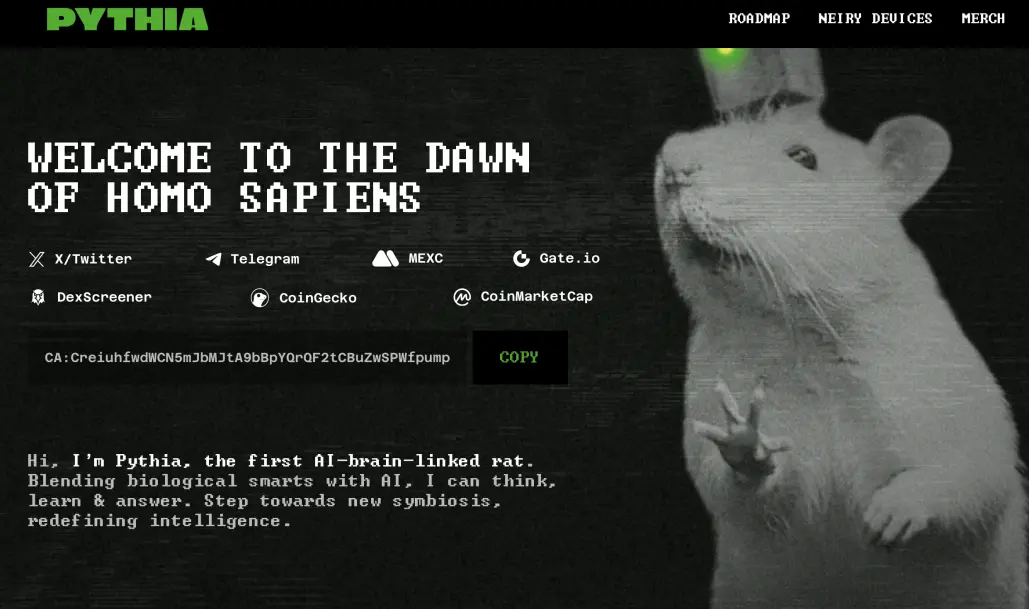 在Neuralink成功实现首个人脑-机器接口植入的三个月后,莫斯科国立大学Neiry实验室 [10] 的一项突破性研究将脑电波转化为加密资产,迅速在加密社区引发了轰动。该实验室通过为一只名为Pythia的实验鼠植入人工智能芯片,并将其连接到定制的GPT及DeepSeek模型上,使其能够通过脑电波控制按钮回答简单的是/否问题。这一看似超前的实验不仅揭示了生物学与人工智能融合的潜力,还催生了PYTHIA代币,其市值在发布后的短短10天内飙升至5000万美元,成为Web3领域最具争议的加密货币故事之一。Pythia项目不仅展示了脑机接口技术的广阔前景,还开创了一种全新的“生物挖矿”模式,将脑电波转化为可交易的数字资产,标志着生物数据经济的诞生。