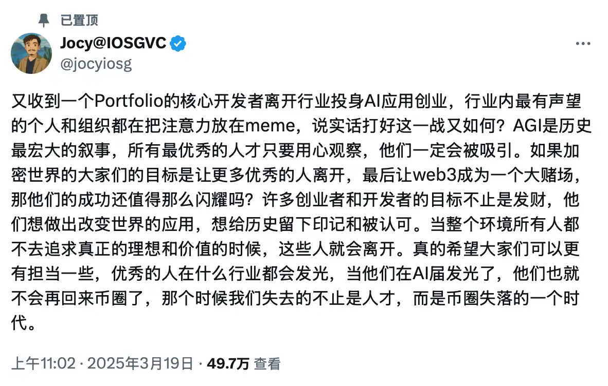 前段时间,IOSG 创始合伙人 Jocy 在社交媒体发文,表示自己投资组合里又一个项目转型去做 AI,并表达了对加密行业前景的担忧。