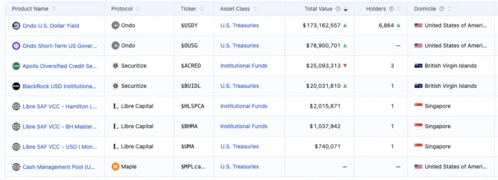相比之下,Solana 与传统金融机构合作较少。同时,Solana 上的 RWA 主要集中在稳定币,其非稳定币资产的比例低于以太坊。目前,主流的国债和其他基金项目如图所示,相关项目的数量和金额均较少;同时,项目的品类较为单一,还未覆盖大规模的商品类 RWA 项目,以及私募信贷、私募股权等领域。