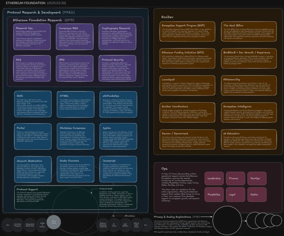 EF 的组织架构可划分为四大职能板块:协议研发(PR&D)、生态发展(EcoDev)、运营保障(Ops)与隐私与扩展探索( PSE)。各板块既各司其职,又在「Protocol Guild」与「Protocol Support」团队的协调下,与外部社区、研究机构及开发团队协作。
