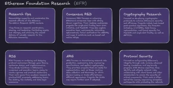 负责协议核心研发的研究团队也在 2024 年底至 2025 年初经历了显著变革。以太坊基金会研究部(EFR)于 2025 年初由原有单一研究团队重组为应用研究组(ARG)、共识研发组(Consensus R&D)、密码学组(Cryptography)、协议安全组(Protocol Security)和激励机制组(Robust Incentives Group, RIG)等五个专责小组。此番拆分源于基金会在密码学与安全领域的快速扩张,需要更专业化的团队聚焦不同研究方向,提升研发效率与透明度。同时,长期研究员 Alex Stokes 和 Barnabé Monnot 的上任联席研究负责人,共同领导研究方向。