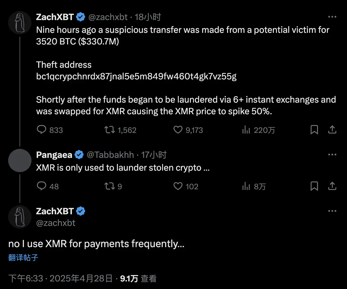 链上侦探 ZachXBT 在社交媒体上发文表示,「九小时前,某地址发生了一笔可疑转账,金额为 3520 枚比特币(约 3.307 亿美元)。随后这些资金通过 6 家以上的即时交易平台开始被洗钱,并被兑换成门罗币,导致门罗币价格飙升 50%」