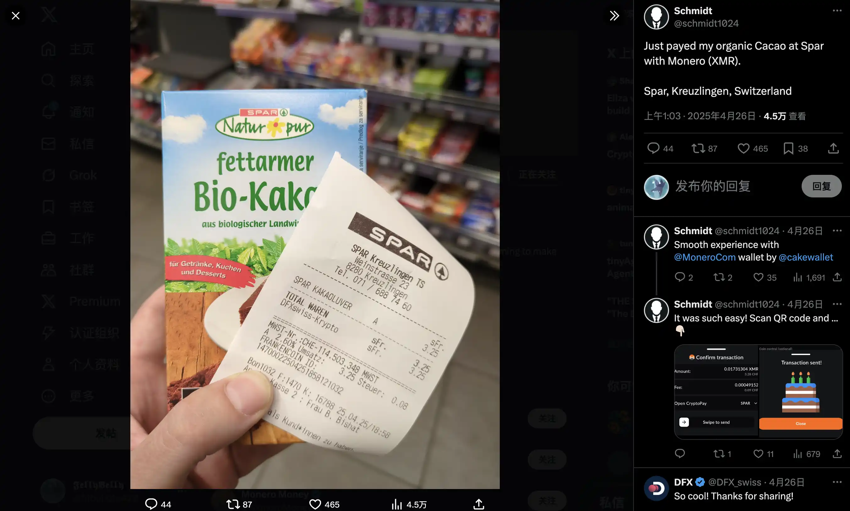 在加密货币活跃的地区,有一些电商或独立商家会接受门罗币作为支付方式,比如一些技术相关的在线商店「硬件钱包或加密货币周边技术产品」或线下的零售店,而社区成员 Schmidt 也晒出了自己用门罗币在 Spar 购买低脂有机可可饮料的收据。