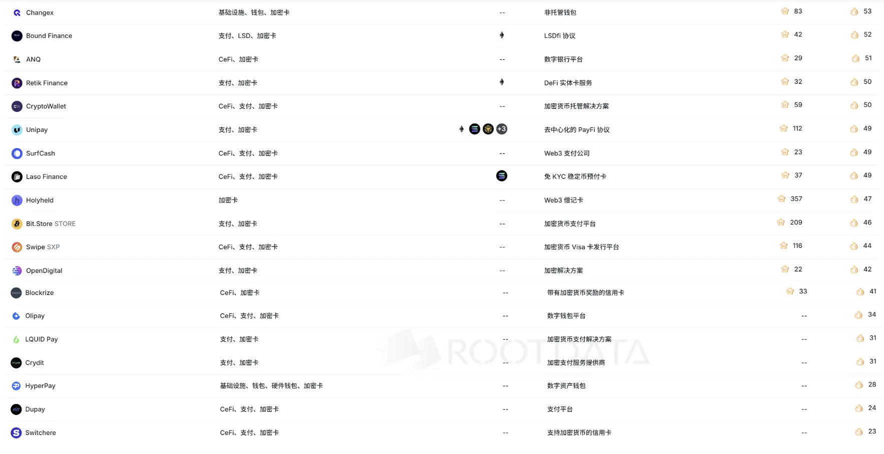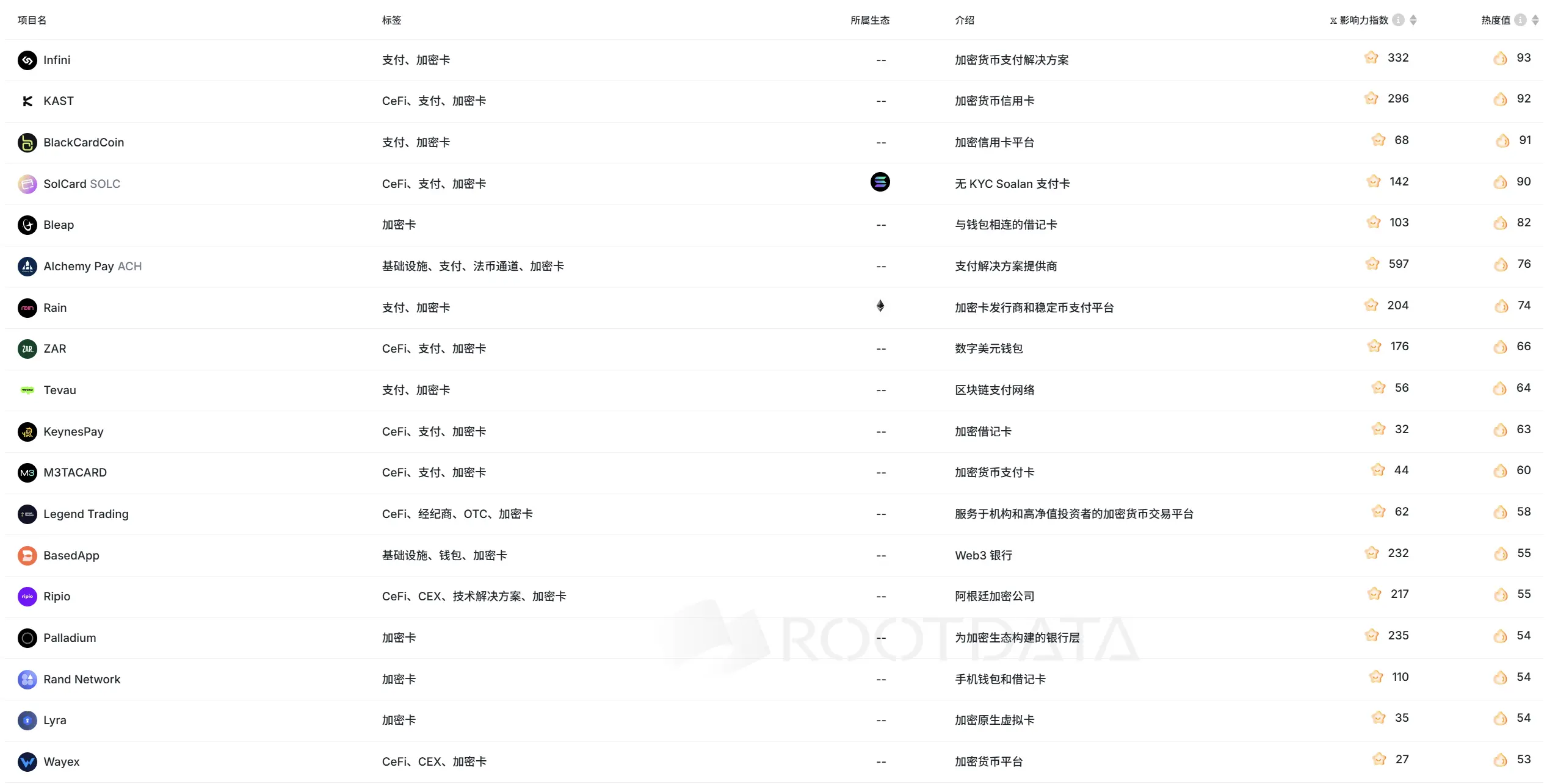 资本在下注,项目在竞速。据 RootData 收录,当前专注于加密卡业务的项目已达 37 家,其中不少获得了头部机构的重注。例如,加密信用卡项目 KAST 完成由红杉中国与红杉印度联合领投的 1000 万美元种子轮融资;加密卡发行商 Rain 则在 Norwest Venture Partners 领投、Coinbase Ventures、Circle Ventures 等跟投下,斩获 2450 万美元融资。