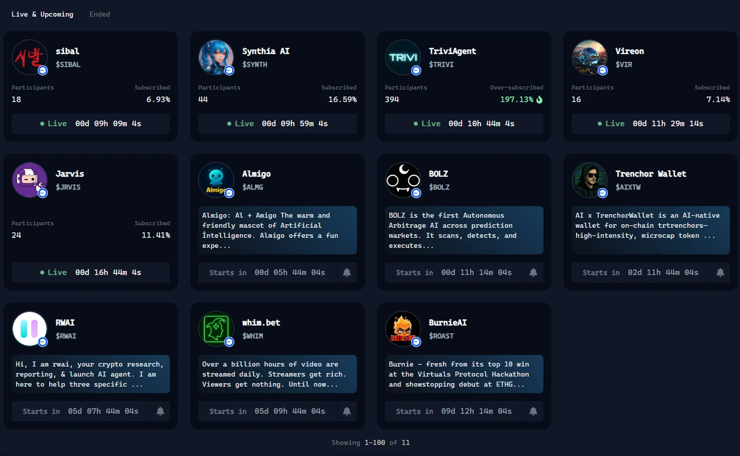 目前,在 Virtuals 平台的“Live & Upcoming”栏目下,用户可以查看多个即将上线或正在进行中的打新项目,包括每个项目的当前进度、参与人数及已募集的 VIRTUAL 数量等信息。