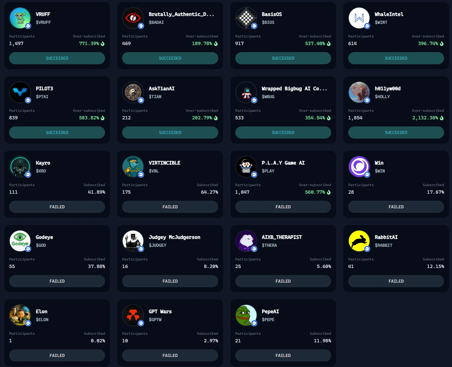 根据官方信息,截止目前已有 19 个项目选择在 Genesis 平台进行首发,其中 8 个项目顺利发售,其中首个打新项目 h011yw00d (HOLLY)超募达 21 倍。 值得一提的是,P.L.A.Y Game AI 虽超募 5.6 倍,但该项目试图在 Genesis Launch 期间进行恶意操作,企图借势牟利、欺骗用户、破坏信任,因此被 Virtuals 官方永久中止上线,并且第一时间已启动赔偿计划,补偿受影响的用户。
