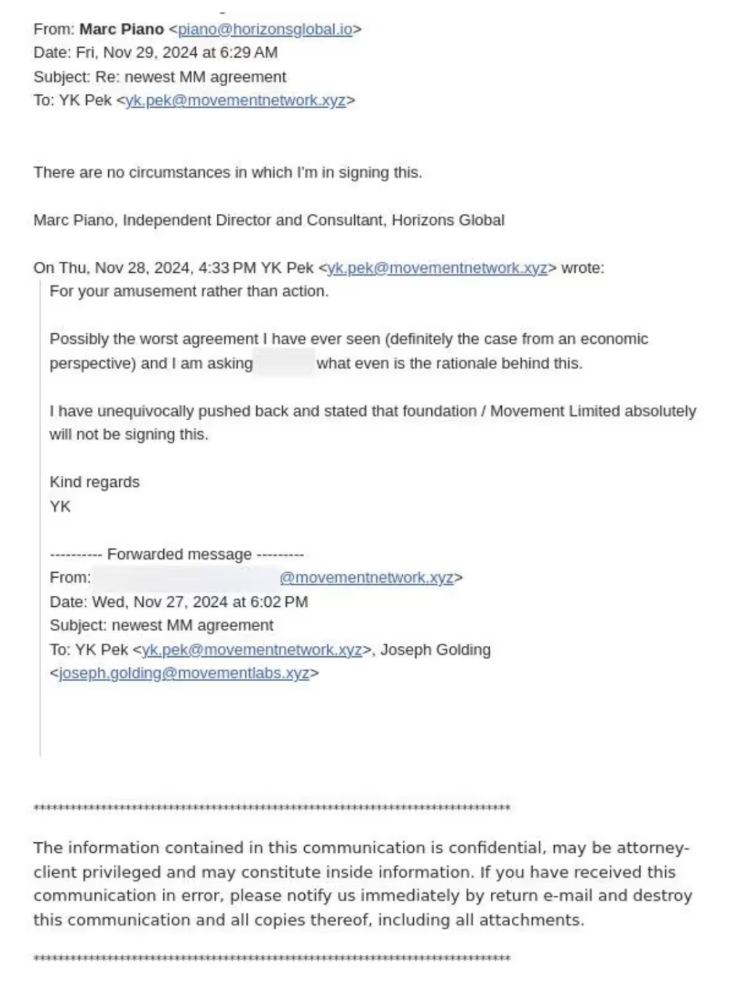 Rentech 作为一家几乎无任何公开背景与链上记录的公司,其大额代币借贷请求立即引发基金会内部警觉。Movement Foundation 法律顾问 YK Pek 在邮件中直言,该文件 “可能是我见过最糟糕的协议”。他在另一份备忘录中进一步指出,协议若执行,等同于将 MOVE 市场的实质控制权交予一个身份模糊的外部实体。