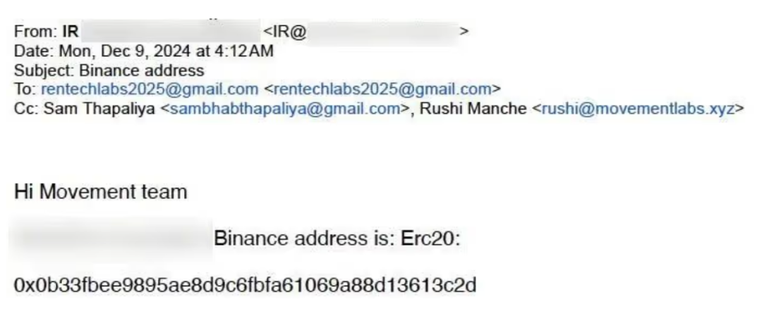 与此同时,另一关键人物 Sam Thapaliya 也引发高度关注。Thapaliya 是加密支付协议 Zebec 的创始人,同时是 Manche 与联合创始人 Scanlon 的长期顾问。他在 Web3Port 与 Movement 之间往来的多封邮件中均被抄送,与 Rentech、Manche 一同出现在重要沟通环节中。