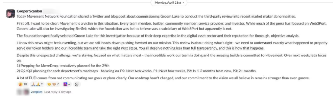 事件爆发后,Movement Labs 联合创始人 Cooper Scanlon 在 Slack 内部通告中强调,公司已聘请外部审计机构 Groom Lake,对近期做市安排中的异常情况展开第三方独立调查。他再次强调:“Movement 在此事件中是受害者。”