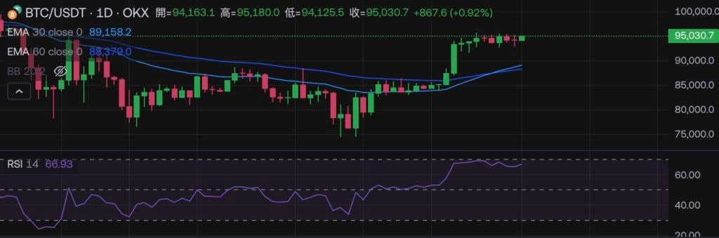 如果比特币能够成功突破并站稳于 $95,000 这一阻力位之上,部分分析师预测,其价格有望挑𢧐更高的目标价位,例如 10 万甚至 11 万美元;但如果未能顺利向上突破,初步支撑位可能位于 30 和 60 日指数移动平均缐(EMA)附近的 $ 88,000。