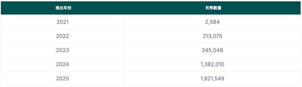 值得注意的是,失败项目的数量在近两年呈现爆炸性增长,特别是 2025 年第一季度,崩溃的代币数量达到惊人的 180 万个,几乎占所有记录失败项目的一半。